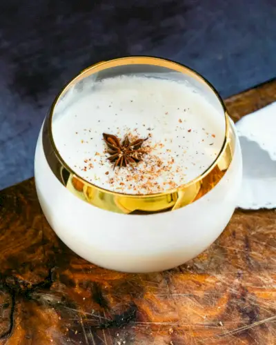 Ingredience: Mléko, brandy, bourbon whisky, jednoduchý sirup, vanilka, muškátový oříšek