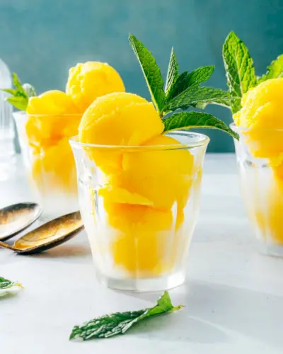 Zde je recept na mango, který je rychlý, snadný, masivně chutný a potěší každého: Mango Sorbet! Je neodolatelně krémová a mrazivá, s čistou medově sladkou tropickou mangovou esencí a limetkovým nádechem na závěr. Je to tak osvěžující a není téměř nikdo, kdo by to odmítl (alespoň v našem výzkumu!). Děti i dospělí jsou fanoušky a funguje to téměř u každé diety. Ještě lepší: prolnutí zabere jen pár minut!