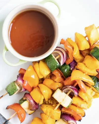 Tyto mangové špízy jsou fantastickým vegetariánským grilovacím receptem, který je plný velké chuti! Napíchněte svou oblíbenou zeleninu na špízy s kousky sladkého manga a poté potřete domácí teriyaki omáčkou. Sladké, slané a slané vše dohromady je symfonií chutí!