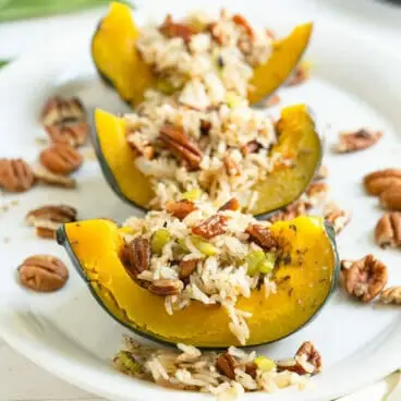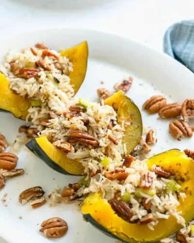 Krémová dýně se orestuje do měkka a poté se obalí nádivkou z opečené pekanové rýže, díky které bude vaše kuchyně vonět jako podzimní ráj! Znáte tu vůni cibule, celeru a pórku připravovaného na másle? No, tenhle recept to dává na jedničku. Je vegetariánská, snadno se vyrábí veganská a přirozeně bezlepková, takže funguje pro všechny druhy jedlíků. Ještě lepší: je to vážně potěšující dav. Každý, komu jsme to naservírovali, se stane věřícím...a pak se hned zeptá na recept.
