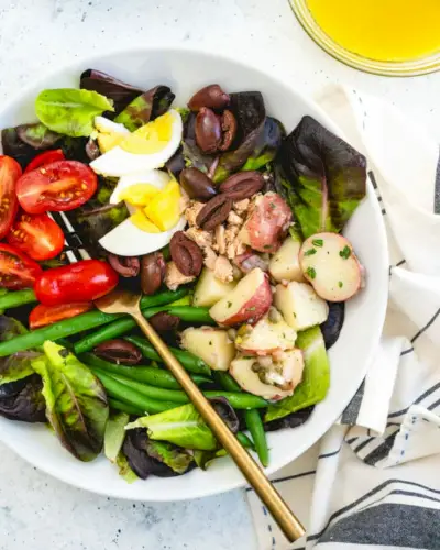 Recepty na zelené fazolky nejsou jen na přílohy! Zde je legendární hlavní jídlo, kde hrají hlavní roli zelené fazolky: klasický salát Nicoise. Tento klasický francouzský komponovaný salát se vyznačuje blanšírované zelené fazolky na zeleném lůžku s olivami, rajčaty, tuňákem, vejce natvrdo , brambory a a žhavý obvaz . Protože je nabitý bílkovinami, zasytí a neuvěřitelně uspokojí.