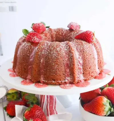 V neposlední řadě v těchto jahodových dezertech: Strawberry Pound Cake! Tenhle je naprostý omračovač, který se vyznačuje jasně růžovým bohatým, vlhkým dortem s jahodovou polevou. Je jisté, že vyhraje při každé příležitosti. přes Africké kousnutí