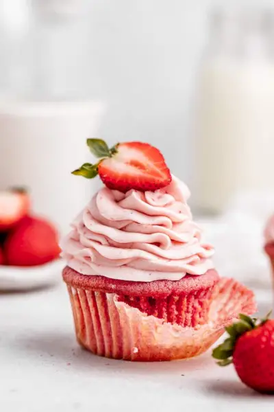 Tyto světlé košíčky z bobulí jsou vlhké a ochucené přírodním ovocem: nic umělého jako dortová směs! Tyto čerstvé košíčky se rozplývají v ústech a jsou vyrobeny od nuly a přelité lahodnou nadýchanou polevou z jahodového máslového krému. přes Dorty pro babičky