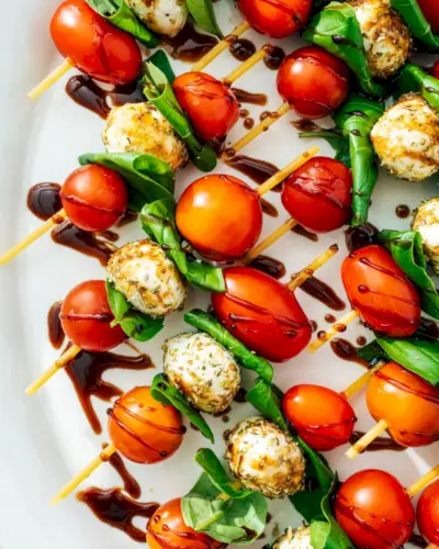 Tento snadný recept nemusí být klasickým italským předkrmem. Ale je to vizuálně ohromující a neodolatelně chutné, oštěpuje všechny složky a Caprese salát na špíz. V létě není nic lepšího než bazalka a rajčata a v kombinaci s kořeněnou mozzarellou a balzamikovou polevou: nebudete moci sníst jen jedno!
