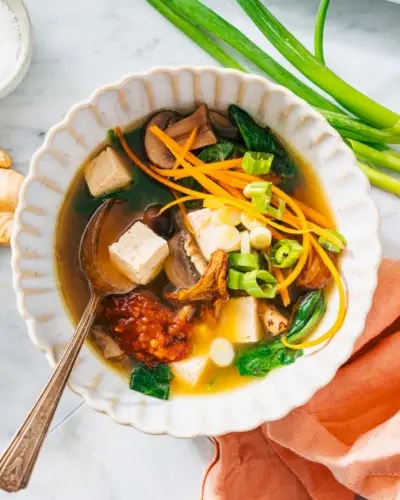 Tento jednoduchý recept na tofu polévku, chutné a výživné rostlinné jídlo, si zamilujete! Kostky tofu plavou ve slaném vývaru ochuceném miso, zázvorem, sušenými houbami a čerstvými houbami. Těsně před podáváním přidejte křupavou mrkev a zelenou cibulku a je to uspokojivá kombinace vydatné zemitosti s křupavou čerstvou zeleninou.