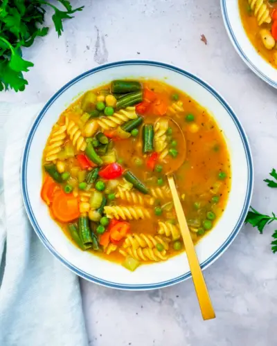 Tato zdravá zeleninová polévka je nabitá co největším množstvím zeleniny! Mrkev, zelené fazolky, paprika, hrášek a fazole tančí ve slaném vývaru. Je to jako čerstvá rotace na konzervované nudlové polévce.
