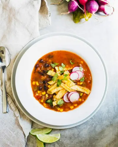 Jedna z našich oblíbených zdravých polévek všech dob? Tato tortilla polévka z černých fazolí! Trvá něco málo přes 30 minut, než se vytvoří krásně jasná, pikantní chuť. Černé fazole a kukuřice plavou v krásném vývaru s nádechem kouřové adobo omáčky.