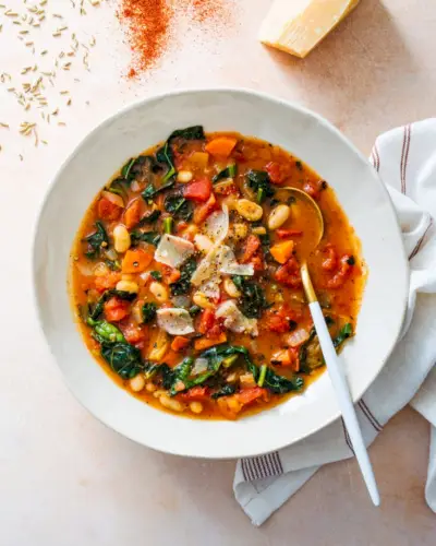 Tato zdravá polévka je plná velkých italských chutí: intenzivní zářivá rajčata, listová toskánská kapusta a krémový vývar vyrobený z parmazánové kůry. V tom všem plave cizrna a těstoviny z názvu polévky, díky čemuž je vydatná a sytá.