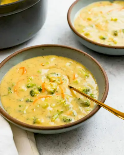 Tato zdravá brokolicová bramborová polévka vypadá jako sýrová, ale všechno je to iluze! Smíchejte kešu ořechy s trochou polévky a vytvořte hustý a krémový korpus, který je plný chuti. Brokolice a mrkev dodají velkou dávku živin.