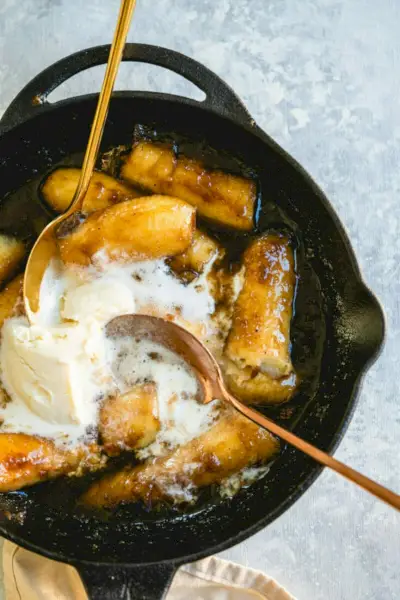 Zde je klasický banánový recept: banány pěstují! Banány se restují v mazlavé omáčce z karamelizovaného cukru a rumu a podávají se se zmrzlinou. Obvykle je také plamen, který přináší vrcholné drama! Tento recept funguje pro dva, i když množství může stačit na čtyři malé porce dezertu. Nejlepší na tom: zvládnete to za 10 minut!