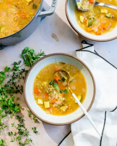 Tato domácí zeleninová polévka je definicí snadné přípravy. Má atmosféru polévky z konzervy, ale chutná nekonečně lépe! Je to jeden z našich oblíbených receptů na polévky, protože je útulný a uklidňující každý to miluje. Recept obsahuje slaný vývar a spoustu rychle uvařené zeleniny.