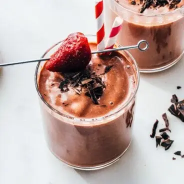 Toto čokoládové jahodové smoothie chutná neuvěřitelně: ale tady je malý trik, jak ho zintenzivnit, pokud ho připravujete jako pochoutku. Posypte hořkou čokoládou! Potřebujete jen asi 1 polévkovou lžíci, a když ji zamícháte, vytvoří se občas chutné kousky čokolády. Je to volitelné, ale zábavný způsob, jak to pozvednout!