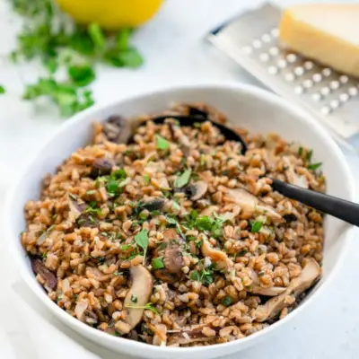 Přidejte cremini houby do celozrnného farro pro chutnou přílohu.