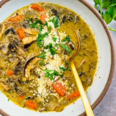 Houby Cremini jsou perfektní pár se zemitou divokou rýží v této krémové polévce. Zkuste také Krémová veganská houbová polévka .