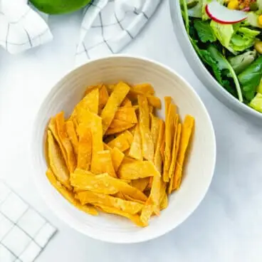Tortilla strips se vyrábí stejným způsobem jako naše domácí tortilla chipsy . Pokud jste si ještě neudělali vlastní chipsy, teď je ten správný čas! Snadno se vyrábějí a při jejich pečení se spotřebuje méně oleje než při smažení. Můžete také kontrolovat množství soli a ujistit se, že neobsahuje žádné přísady. I když nevypadají přesně jako vaše oblíbená značka chipsů, jsou si zatraceně blízko! A je to zábavná dovednost umět namíchat žetony na požádání.