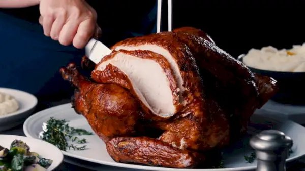 Spusťte krocana do horkého oleje a smažte 3 minuty na libru, 36 minut. Zvedněte košík z fritézy a nechte krocana na 15 minut vykapat na mřížce umístěné na pečicím plechu s okrajem. Nakrájejte a podávejte.