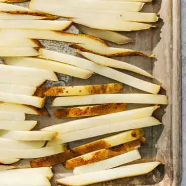 - Pokud děláte Domácí pečené hranolky , můžete přeskočit krok namáčení a přistoupit přímo k dochucení hranolků (uvařte je přímo zmražené a podle potřeby přidejte několik minut k době pečení, dokud nebudou křupavé zvenku a měkké uvnitř).