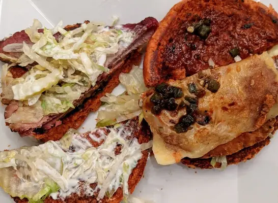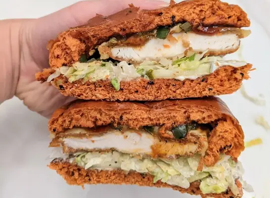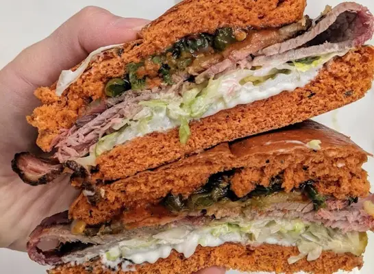 Sendviče sa ukázali ako zložité a viacvrstvové s ešte väčším počtom fixov, ako boli inzerované. Okrem syra, papriky, BBQ omáčka a mäso podľa výberu; Medzi spálenými buchtami zafarbenými Sienna, škvrnami tmavým tehlom korenia, boli pokrčené uhorky, ľadové šalátové kúsky a prekvapujúce množstvo vodnatého maya. Široká rozloha kuracieho mäsa sa rozjasnila po jednej pláte, zatiaľ čo zložený kúsok skutočného hovädzieho hrudníka bol stredobodom druhého.