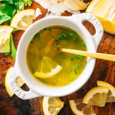 Hledáte chutnou a snadnou omáčku? Tato citronovo česneková máslová omáčka obsahuje pouhých 5 ingrediencí a chutná jako sen! Omáčka je prošpikována nádechem čerstvé citronové šťávy a neodolatelnými pikantními tóny česneku. Je to ideální omáčka k rybě nebo kuřecímu masu a je skvělá k namáčení nebo podlévání grilované nebo pečené zeleniny. Opravdu cokoli chutná lépe s trochou česnekově citrónové máslové omáčky (alespoň podle našeho názoru!).