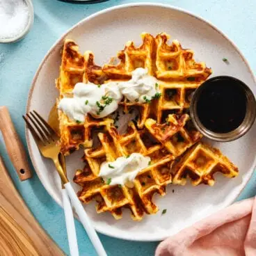 Tento recept na bramborové vafle je perfektní, pokud vám náhodou zbydou bramborová kaše , ale můžete je udělat kdykoli. Lahodná sýrová, pikantní bramborová příchuť vás chytne! Tento se v naší rodině velmi dobře osvědčil a milovali jsme jak slané, tak sladké způsoby, jak je podávat. Kromě bramborové kaše nepotřebujete mnoho, abyste je spojili: