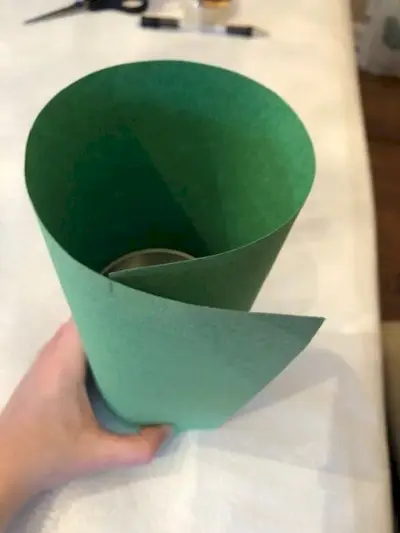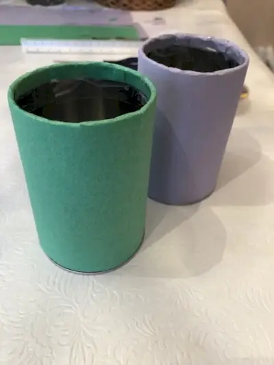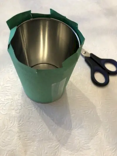 První čajovou plechovku, kterou jsem se pokusil zakrýt, jsem použil celý kus stavebního papíru, což způsobovalo potíže v pozdějších krocích. Místo toho doporučuji volně obalit papír kolem plechovky a označit místo, kde se papír překrývá.