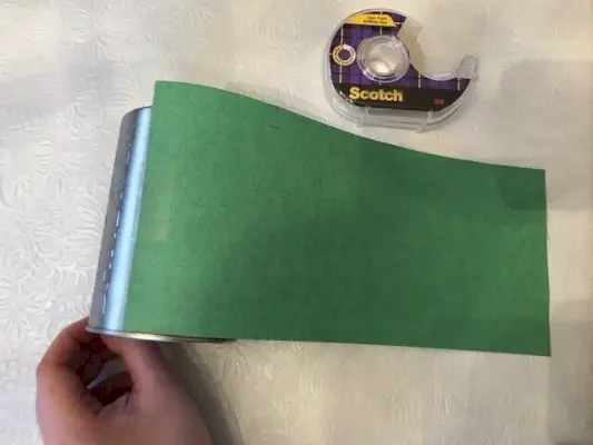 Přilepte jeden okraj stavebního papíru k plechu, označenou stranou dolů – pro tento krok stačí jeden kus pásky. Omotejte papír kolem plechu a přelepte šev, tentokrát pomocí několika kusů pásky, aby papír ležel naplocho. Zjistil jsem, že je nejsnazší ještě neprolepit šev až do konce.