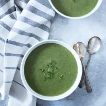- Přidejte vývar, vodu, ½ lžičky košer sůl a bílé fazole. Přiveďte k varu a poté vařte 15 minut. Na poslední 2 minuty vmícháme špenát, koření a další 1 lžičku košer sůl . Zahřívejte, dokud špenát nezvadne. Pyré v mixéru nebo pomocí ponorného mixéru. Pokud je polévka příliš hustá, přidejte ještě pár lžic vody, dokud nedosáhnete požadované konzistence (to může být nutné i při ohřívání). Podáváme ozdobené nakrájenou pažitkou.