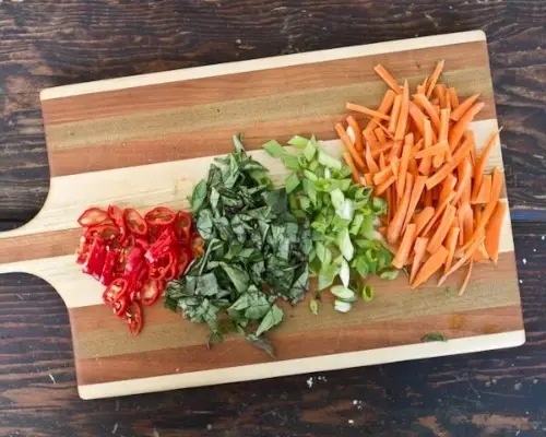 - Připravte si zeleninu: Omyjte veškerou zeleninu. Nakrájejte listy salátu a thajskou bazalku. Mrkev oloupeme a nakrájíme na jemné proužky. Tence nakrájejte zelenou cibuli a červené chilli.