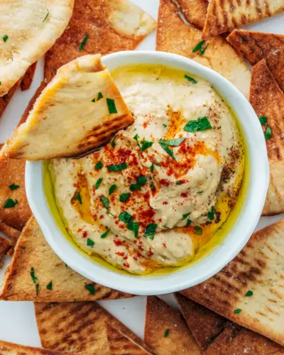 Hummus je perfektní s plackami, chipsy nebo sušenkami: bude se hodit opravdu každý křupavý a křupavý chléb! Zde je několik nápadů, včetně pita chleba a dalších: