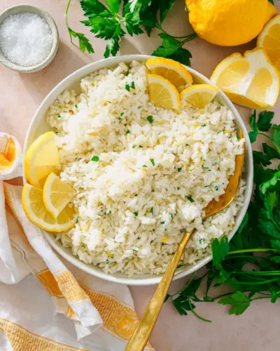 Jedna z našich vrchních stran k podávání s lososovými placičkami: tento recept na citronovou rýži! Jen pár jednoduchých ingrediencí posouvá standardní rýži na další úroveň. Jednoduše přidejte citronovou šťávu a kůru, čerstvý česnek a trochu petrželky do hrnce s rýží a nadechne se pikantní citrusová chuť, která je jednoznačně neodolatelná!