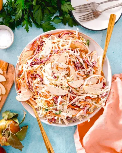 Jako poslední nápad, co podávat s lososovými placičkami, vyzkoušejte tento kapustový salát! Tato barevná směs čerstvé zeleniny se snadno skládá a chutná osvěživě sladký koláč. Obsahuje vydatnou kapustu, křupavá jablka, sladkou mrkev a pikantní dresink z javorového jablečného octa.