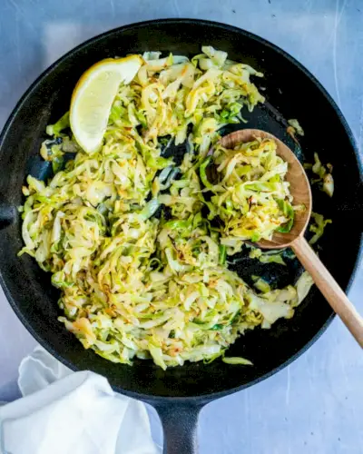 Nakonec, co podávat s plněnou paprikou: dušené zelí! Zabere pouhých 10 minut, než se orestuje do jemné, pikantní směsi chuti. Citron, česnek a černý pepř to posouvají na rockstar vegetariánský status. Tento chutný způsob přípravy zelí si zamilujete: je to jednoduchá příloha ke každému jídlu.